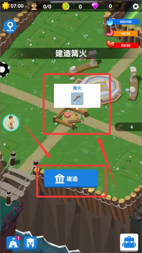 4、最后打開建造菜單,選擇篝火圖標并拖至空地。當出現綠色輪廓時松手,系統會自動播放建造動畫并生成取暖用的營火。