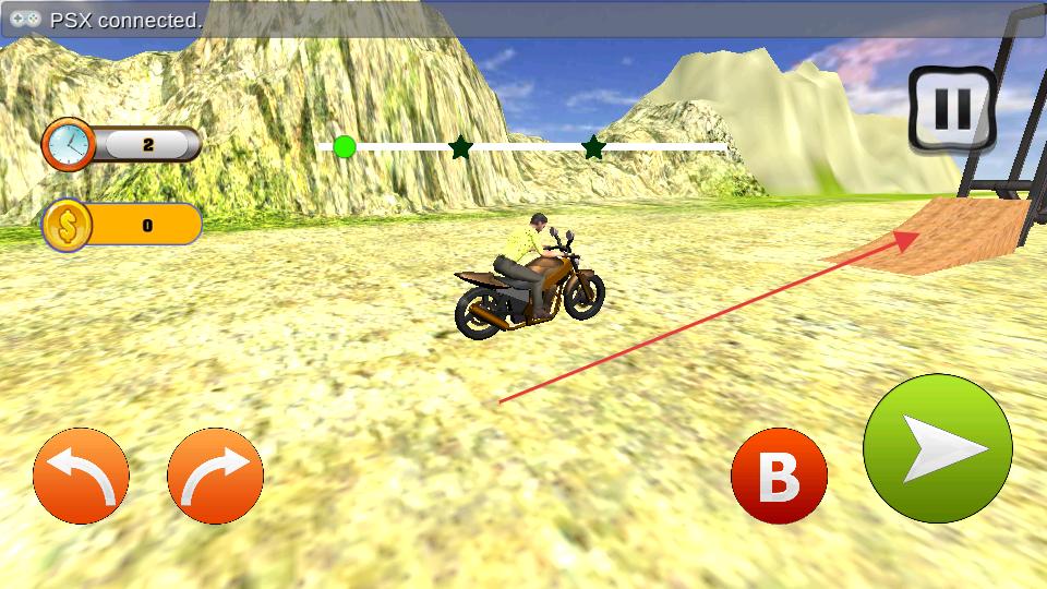3、進入游戲關卡后,操控摩托騎手,利用左右箭頭按鈕控制方向,點擊綠色箭頭按鈕加速,駕駛摩托沖向坡道完成特技。