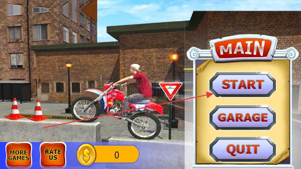 1、打開摩托賽車特技大師,主界面找到START按鈕,點擊進入游戲關卡選擇,可開始挑戰摩托特技騎行。