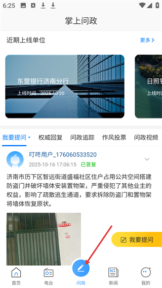 4、問政板塊是掌上問政平臺,可提問、查看權威回復,如濟南社區公共空間問題已答復,助力市民參與政務互動。