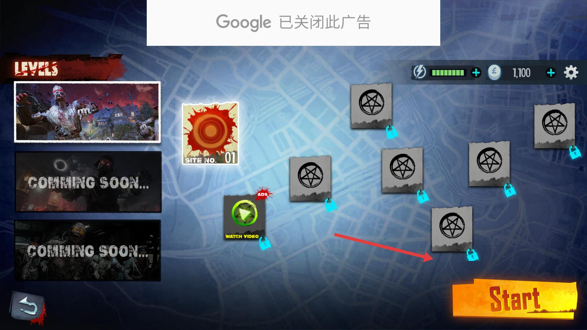 1、進入游戲,在關卡地圖選解鎖的關卡,點擊對應圖標,按下開始鍵,進入戰斗場景,準備迎戰僵尸。