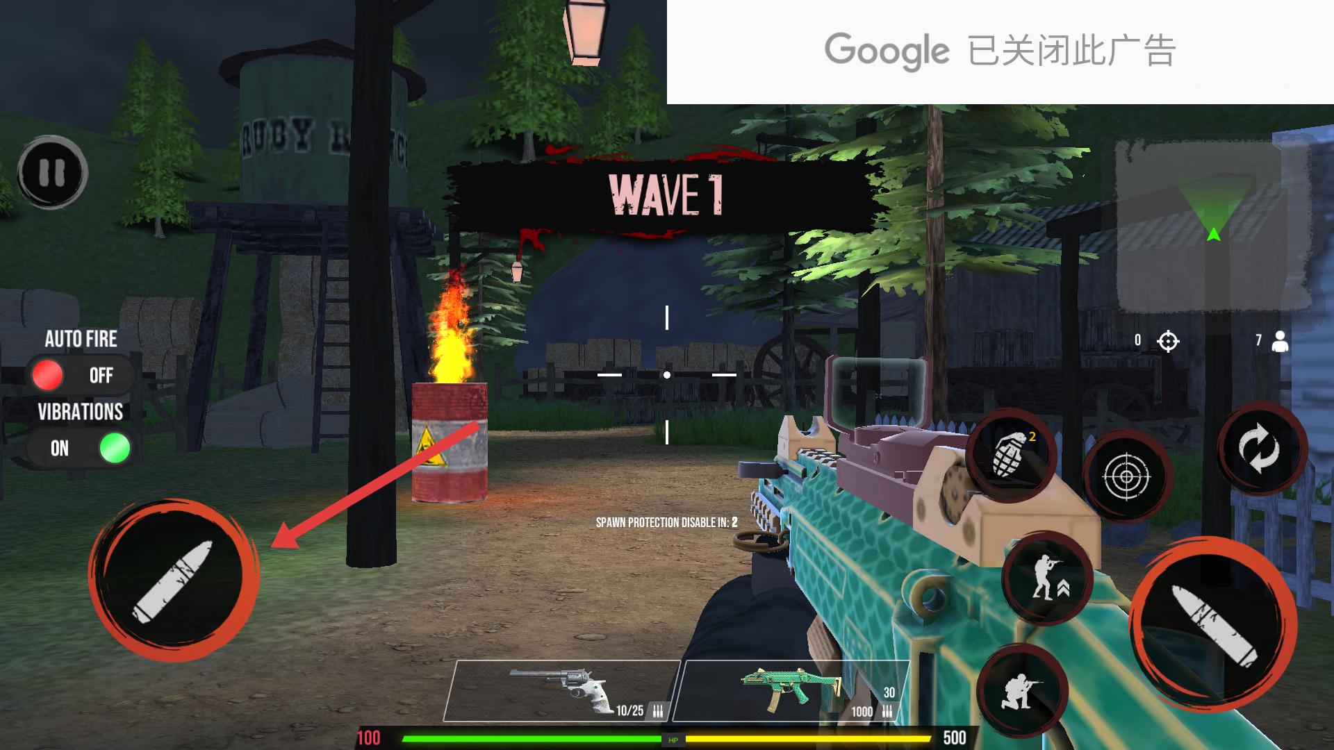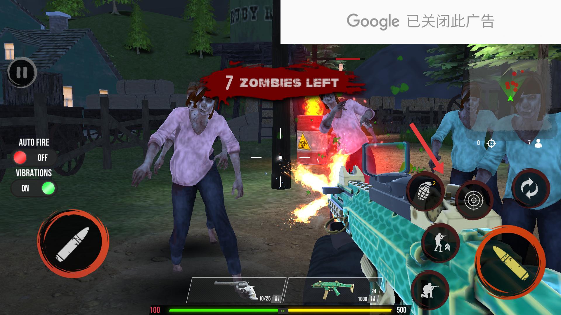 2、戰斗時滑動屏幕移動準星,點擊射擊按鈕開火,留意場景道具,根據自動射擊、振動等設置,應對首輪僵尸。