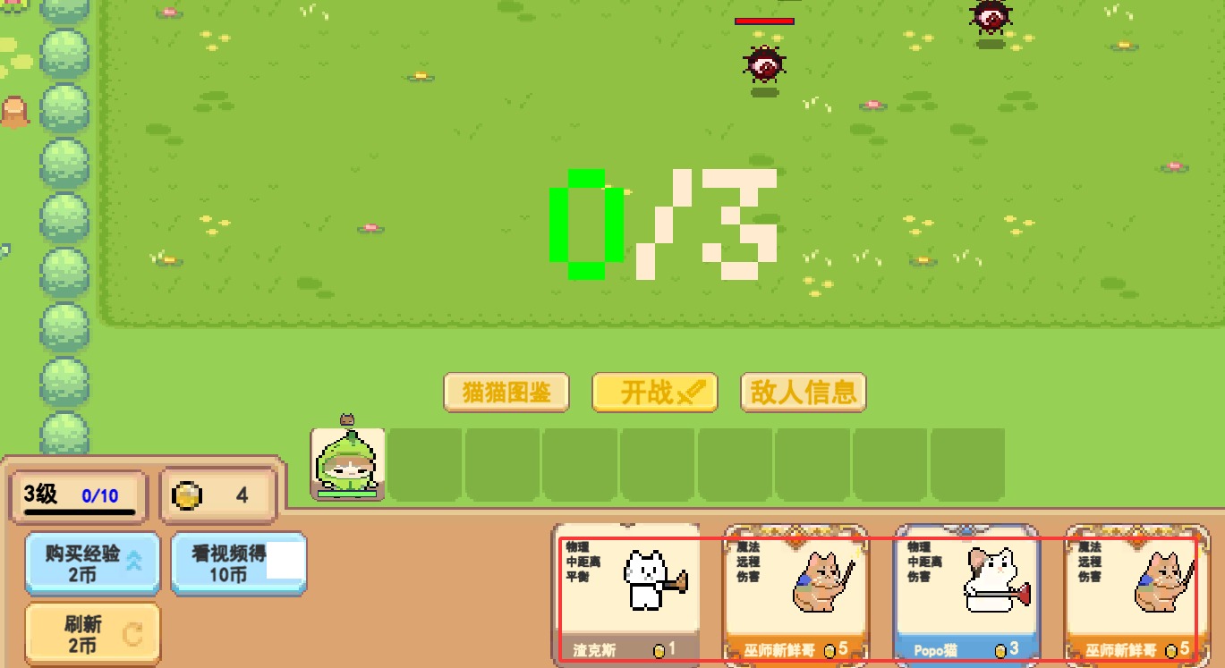 1、基礎玩法采用經典自走棋模式,通過消耗金幣招募貓meme棋子,在棋盤上布置陣型。每回合自動戰斗,存活到最后者獲勝。