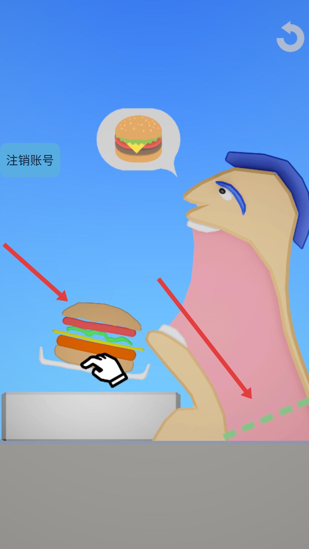 1、觀察人物需求,拖動漢堡至嘴邊,確保路徑無阻礙,讓人物順利吃到漢堡,完成喂食任務。