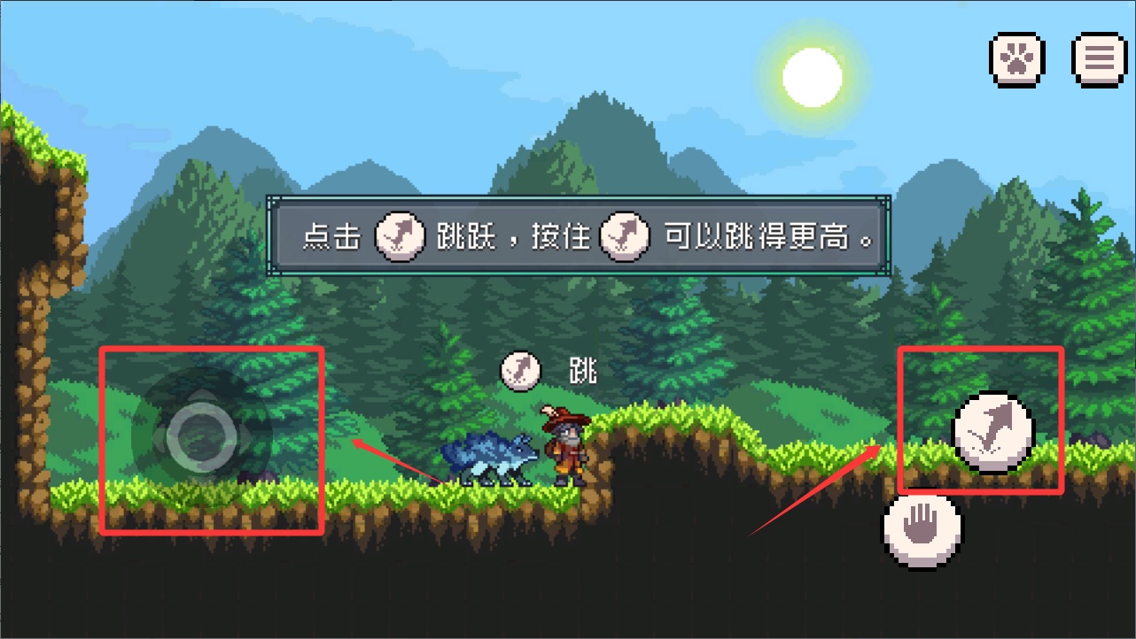 4、游戲操作區域分為左右兩側:左側虛擬搖桿控制角色移動方向,右側的跳躍按鈕帶有向上箭頭標識,長按可實現更高跳躍。