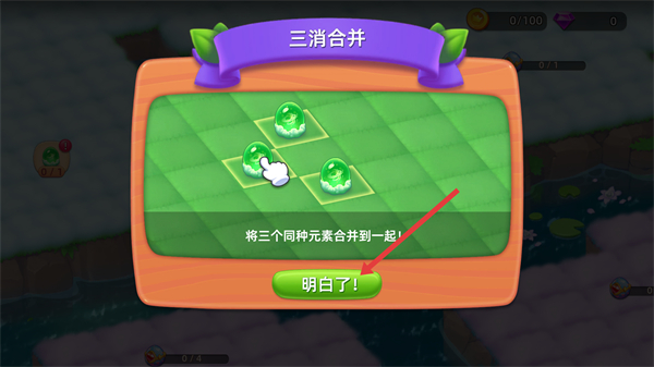 3、在三消合并界面,玩家將三個同種元素合并到一起,點擊明白了可繼續游戲,掌握合并規則。