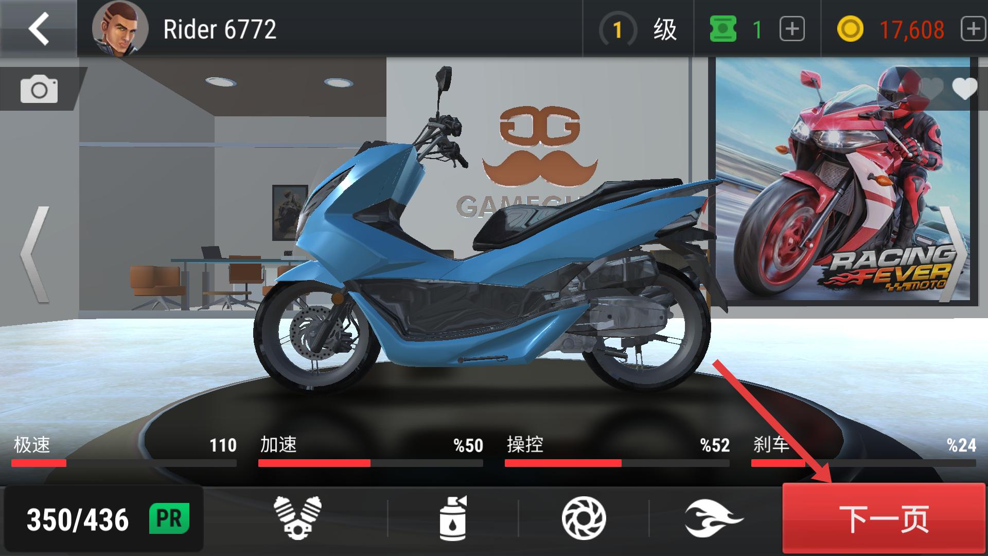 2、在摩托展示界面,查看極速、加速等屬性,點擊下一頁,了解更多摩托信息,選擇心儀車輛參與競賽。