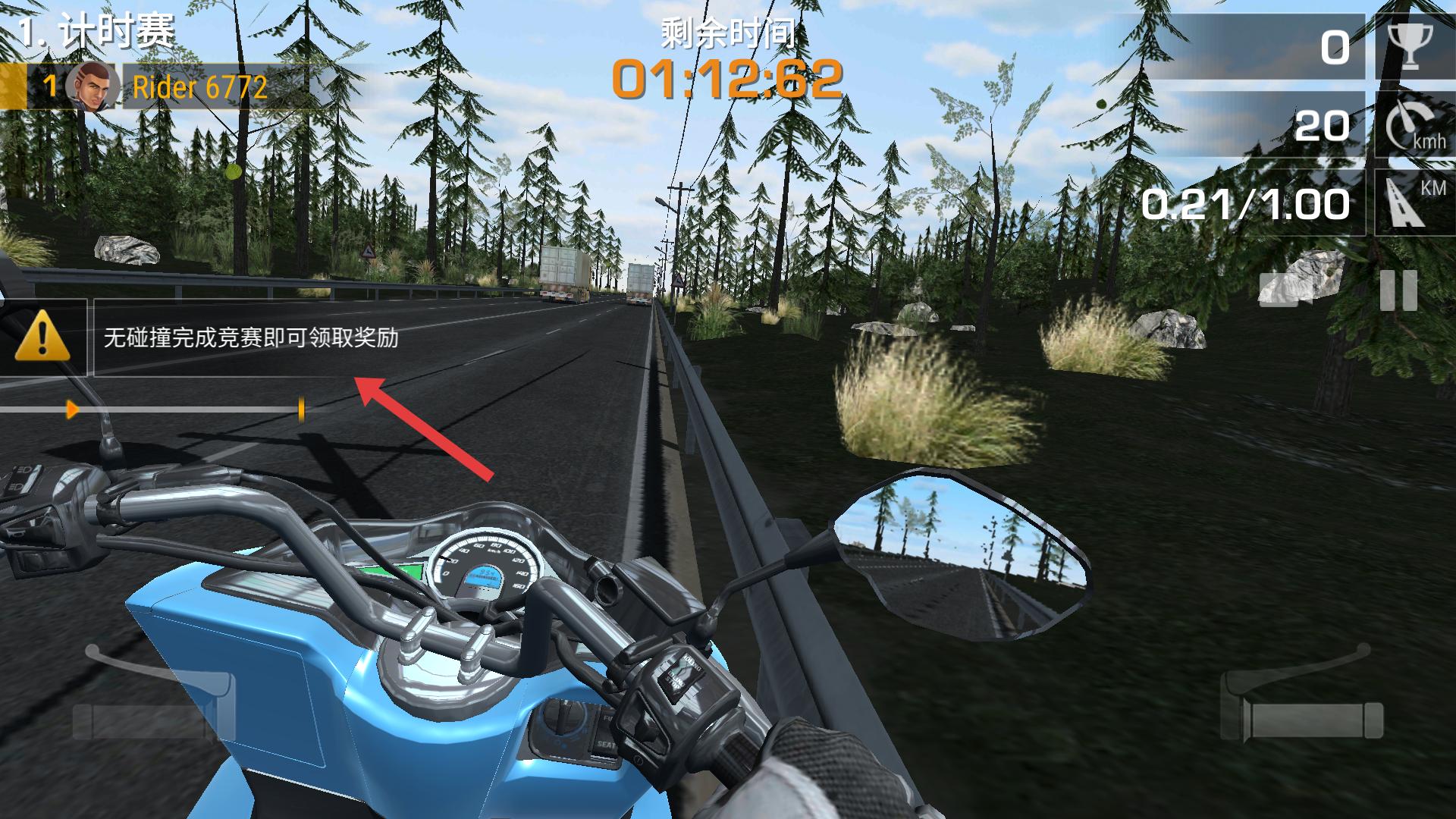 3、進入計時賽,沿公路行駛,避開車輛與障礙,保持無碰撞,利用剩余時間,沖刺終點,領取無碰撞獎勵。