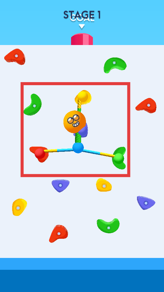 2、游戲中調整角色連接的彩色部件,抓住巖壁支點,向上攀爬,抵達頂部目標完成關卡。