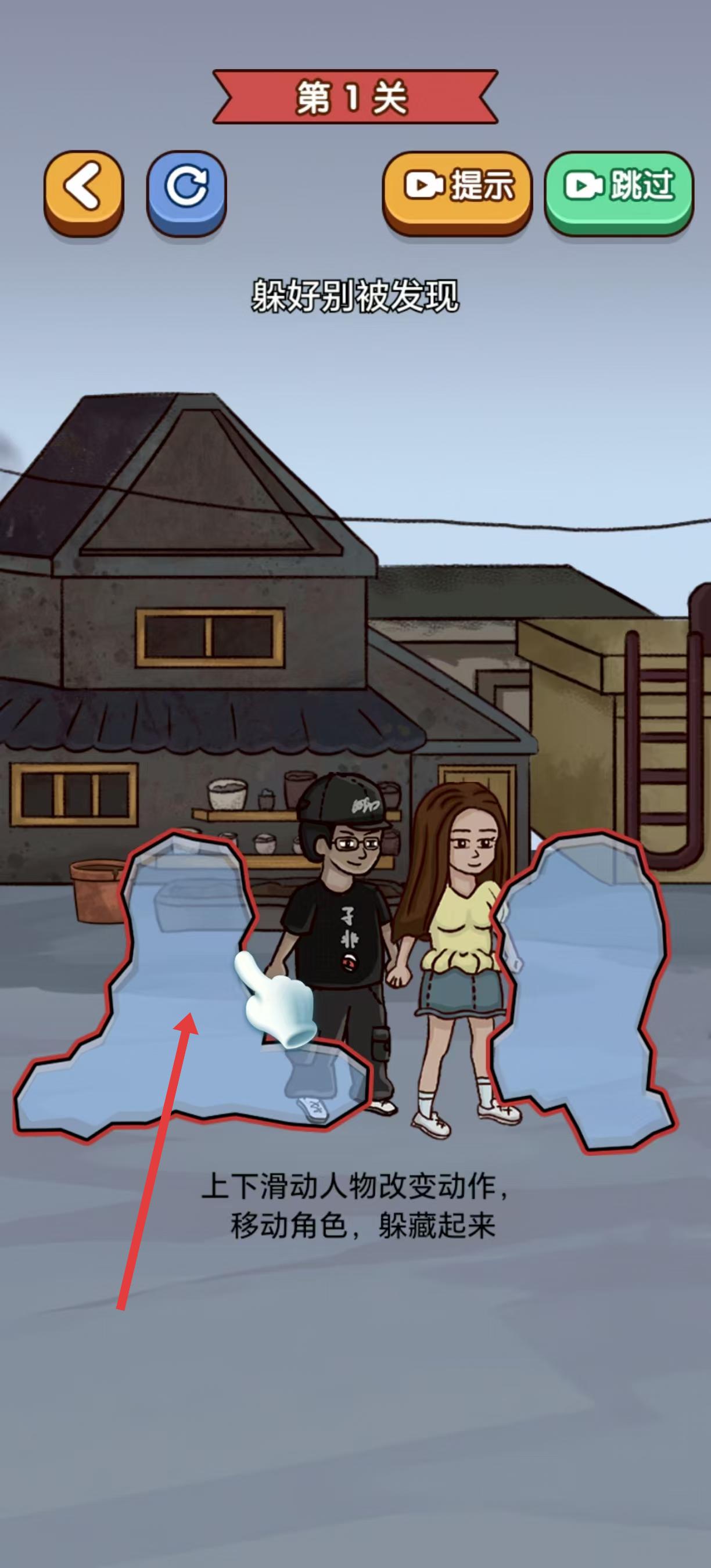 3、進入第1關后,依據提示,上下滑動人物改變動作,移動角色到透明輪廓內,讓角色躲藏,避免被發現。