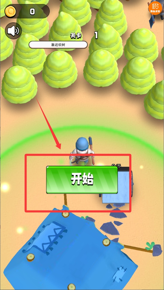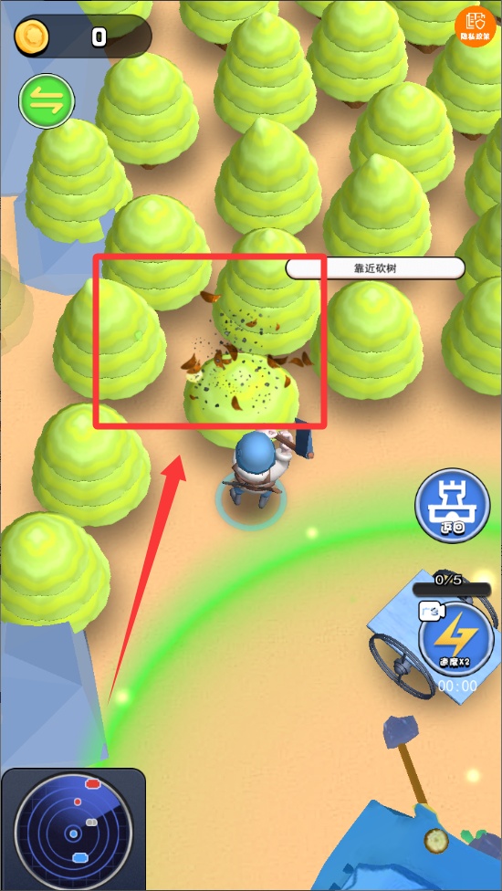 3、操控角色移動到森林區域會自動觸發伐木動作,每棵樹可采集5-10個木材資源,收集時有進度條顯示。