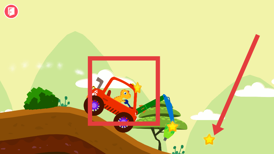3、會看到駕駛挖掘機的恐龍,玩家需要操控車輛在地形起伏的場景行駛,收集道路上的星星等道具,行駛即可完成游戲。
