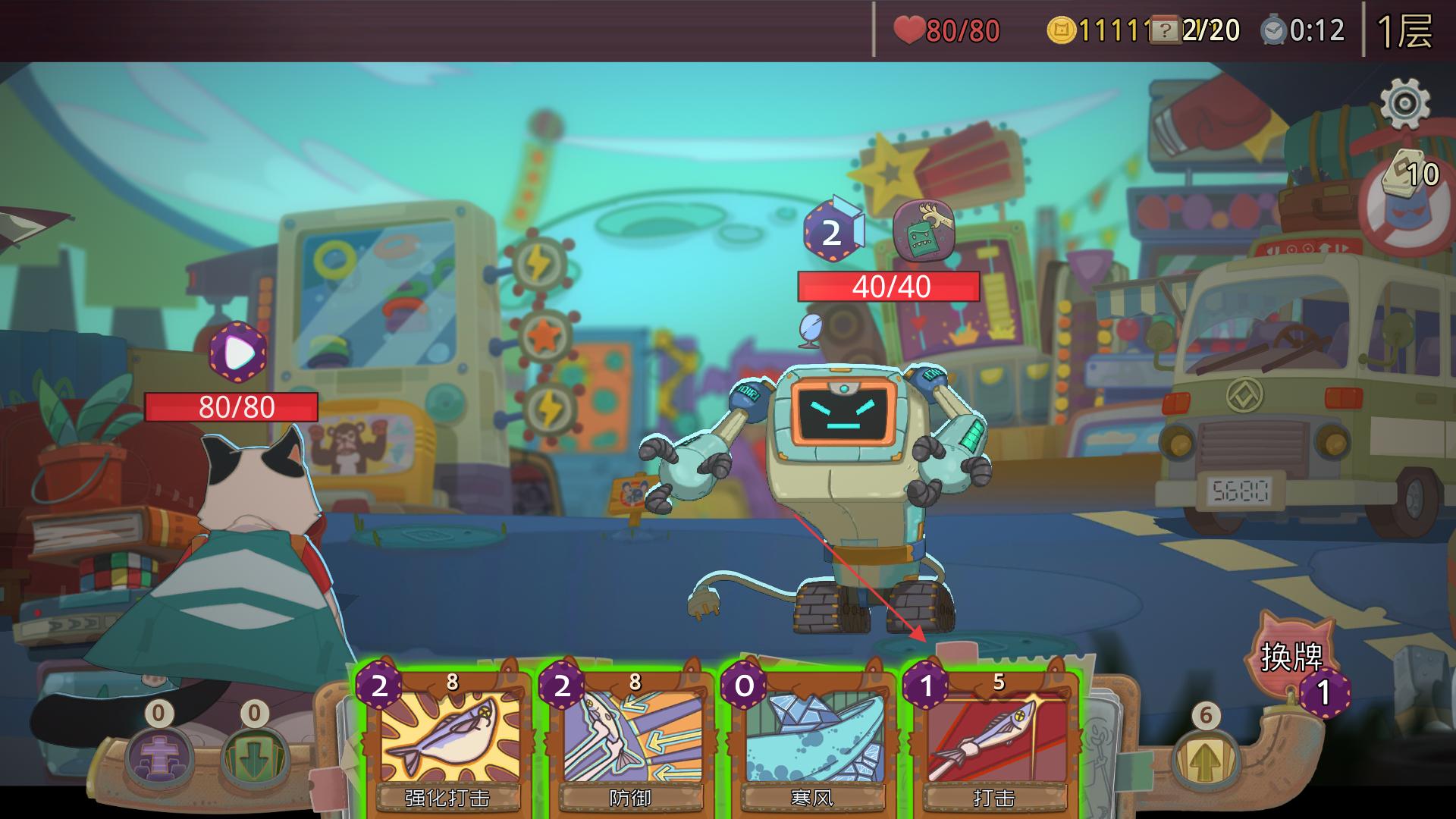 2、戰斗時觀察敵方機器人血量與技能,搭配強化打擊、防御等卡牌,合理釋放,消耗敵方血量。