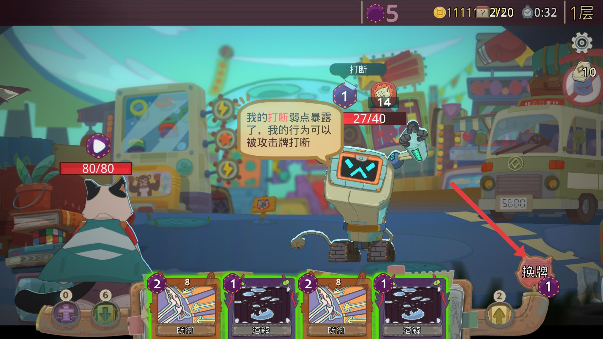 3、當敵方暴露打斷弱點,及時點擊換牌,調整卡牌組合,用攻擊牌打斷其行動,掌握戰斗節奏獲勝。