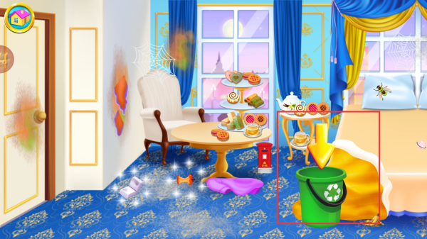 2、玩家進入公主房間首先需要先清理雜亂,把垃圾拖進綠色回收桶、擦拭墻面上污漬、清掃地面雜物等,恢復整潔后會出現隱藏購物線索,助力后續購物之旅。