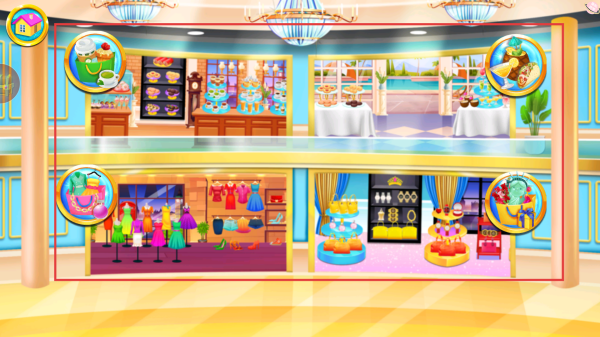 3、完成清理后會來到雙層商場,商場每層有不同購物主題區,上層是美食區下層是時尚區,玩家點擊任意區域完成區域購物任務,解鎖高級購物權限與公主專屬時尚單品。