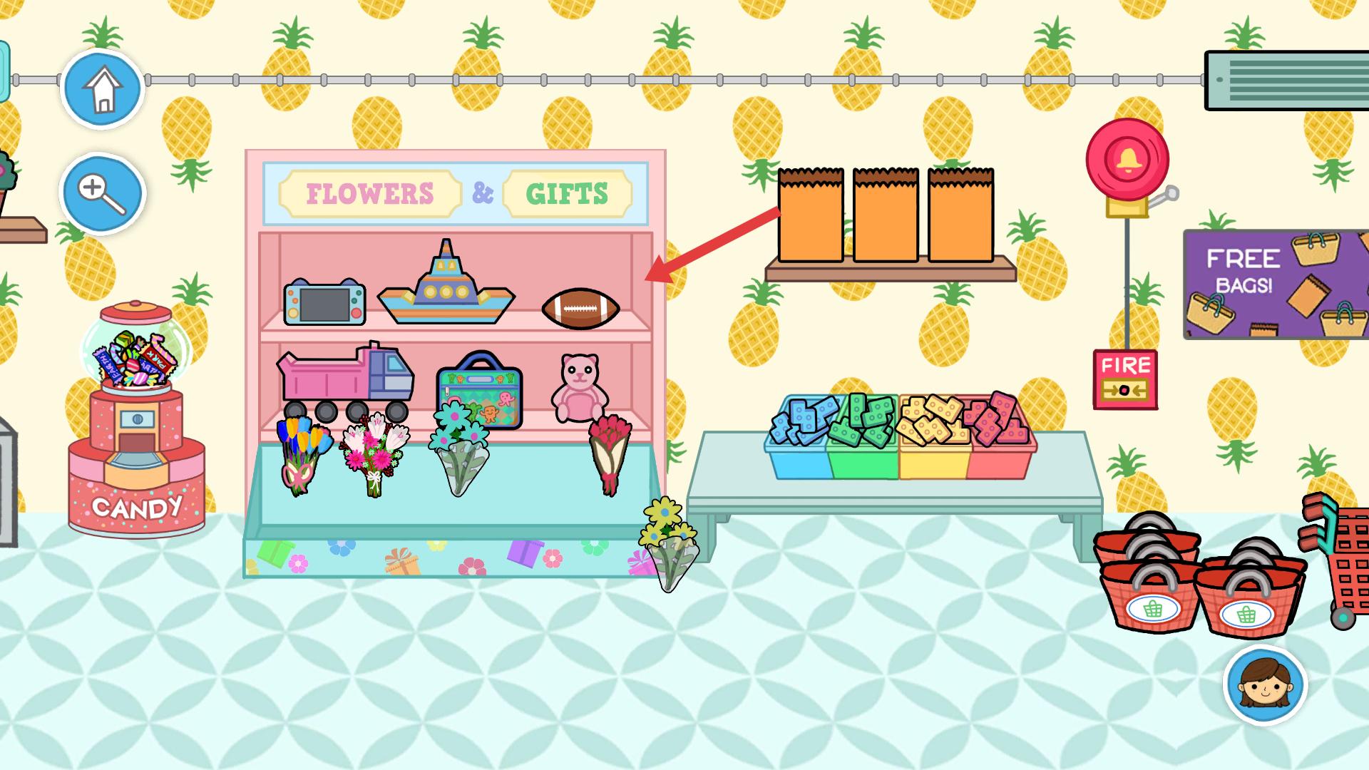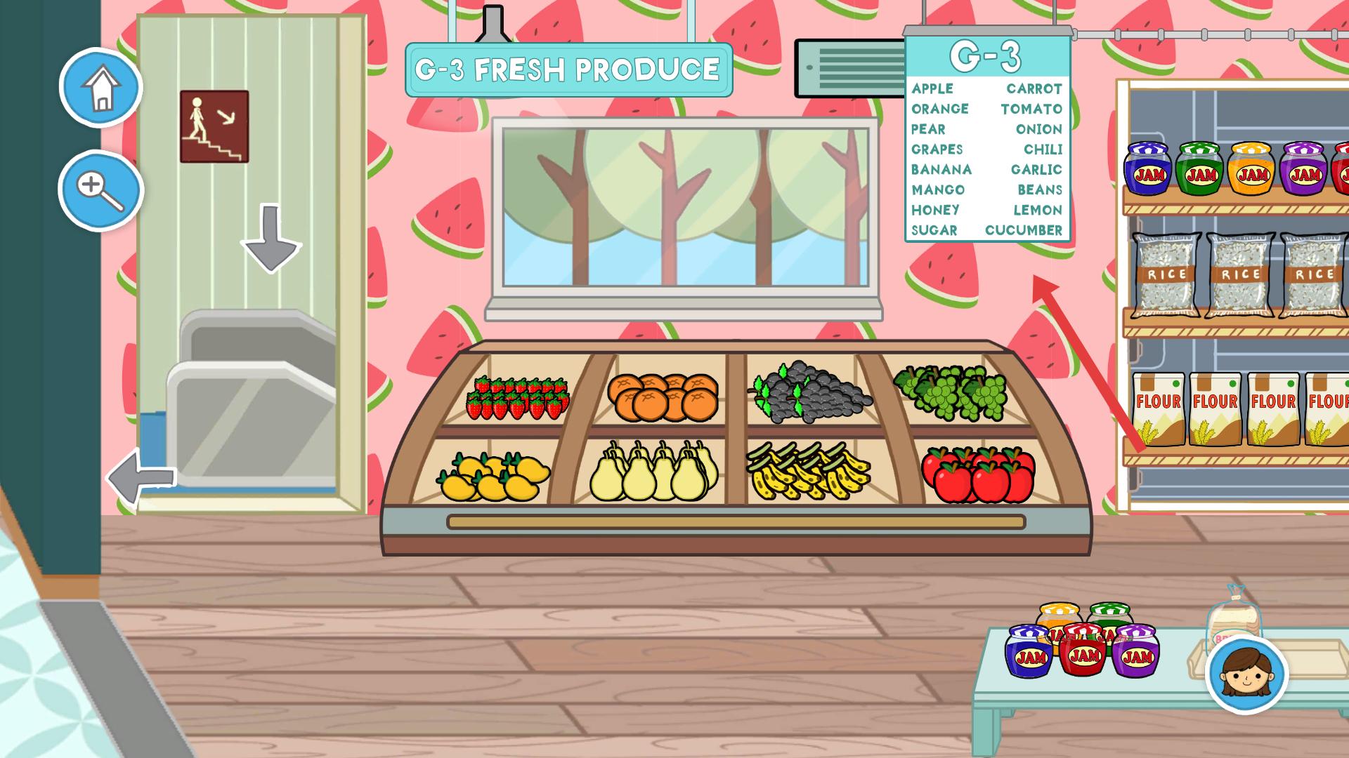 3、切換不同店鋪,像禮品店、果蔬店等,探索各類商品,根據需求收集物品,完成購物任務推進游戲。