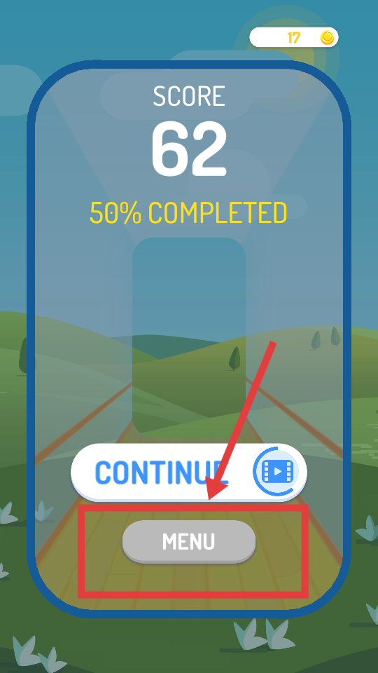3、一局結束后界面顯示得分和完成進度,點擊MENU按鈕可返回主菜單,選擇重新挑戰或其他操作。