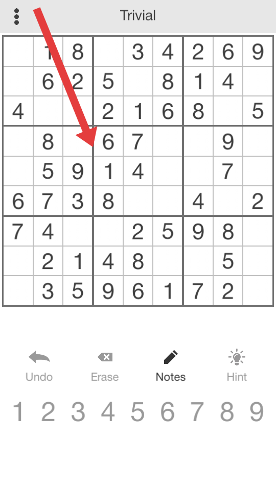 1、進入數獨游戲界面呈現初始數字棋盤,需依據數獨規則觀察空格所在行,列,宮已填數字,思考可填數值。