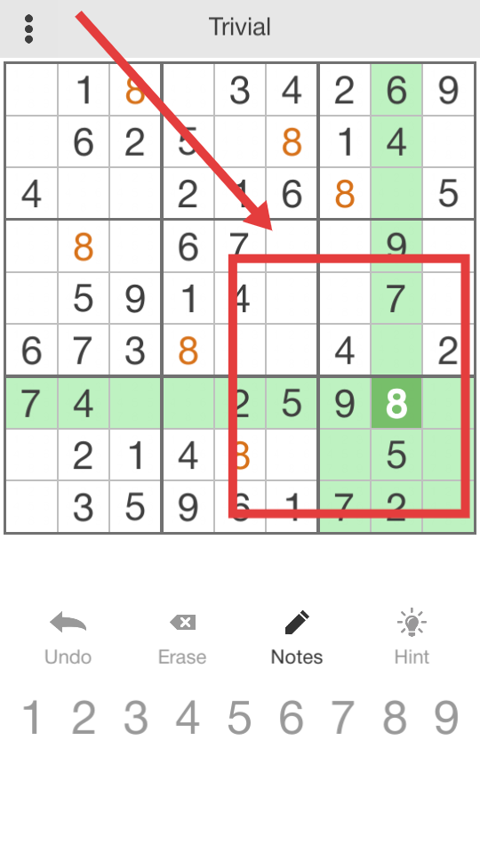 2、針對高亮空格區域,分析其所在行,列,宮內已有的數字,排除重復數值確定可填入的數字范圍。