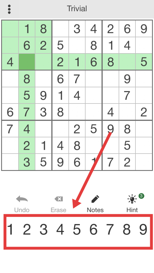 3、點擊下方數字鍵選擇符合規則的數字填入空格,逐步填滿棋盤完成數獨解謎,若有誤可借助Undo,Erase等功能調整。