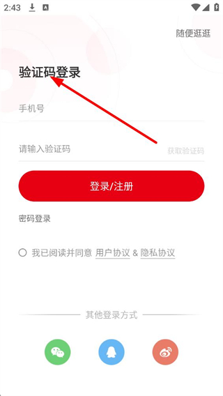 1、進入登錄界面可選擇驗證碼登錄,輸入手機號、驗證碼后點擊登錄、注冊,也可選擇密碼登錄或微信、QQ、微博等其他登錄方式,完成登錄操作。