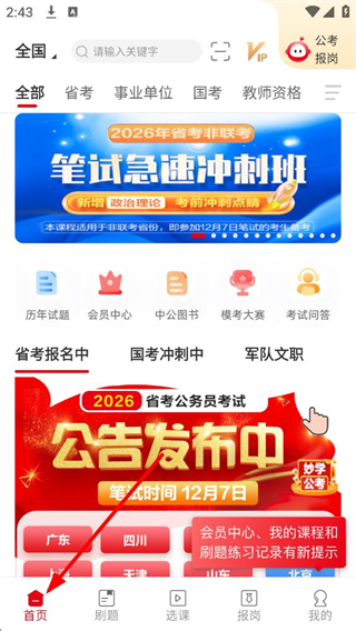 2、登錄后進入首頁,可看到全國范圍的公考分類,如省考、事業單位等,還有歷年試題、會員中心等功能入口,以及省考公告發布等信息展示。