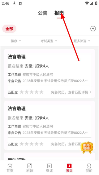 3、報崗板塊可查看各類崗位信息,如法官助理等崗位的招錄人數、工作單位等詳情,還能查看崗位匹配度,完善簡歷了解匹配情況。