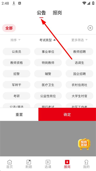 4、公告板塊可篩選公務員、事業單位、教師招聘等多種考試類型,找到對應考試公告,獲取招考信息,助力公考報考。