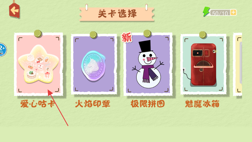 2、在關卡選擇頁,看到愛心咕卡、火焰印章等不同主題關卡,點擊愛心咕卡關卡,進入對應創意制作場景,開啟咕卡創作。