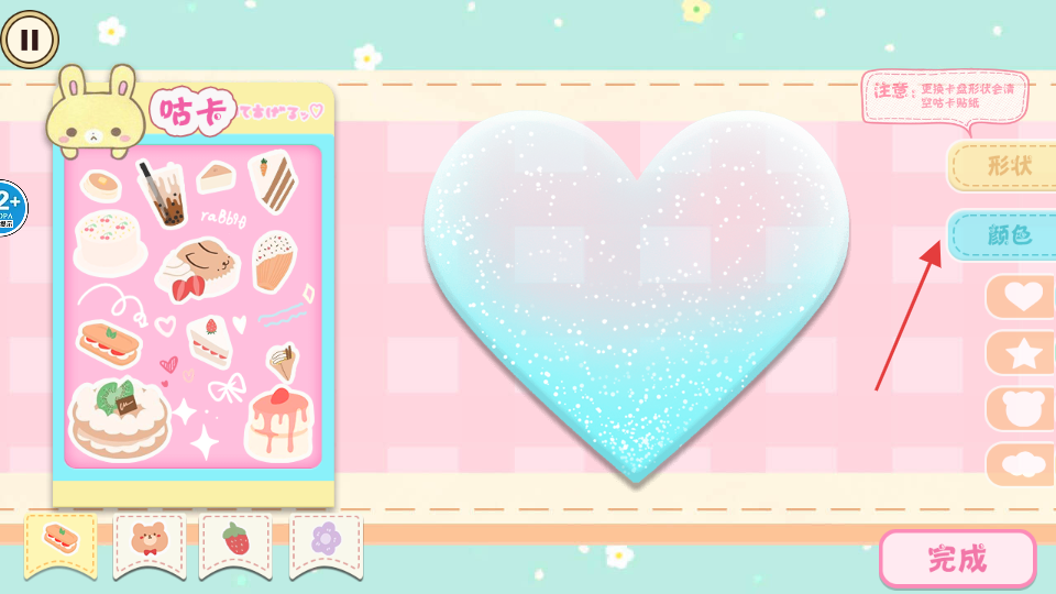 3、進入愛心咕卡制作界面,左側有各類美食貼紙,右側可調整心形咕卡的形狀、顏色等,挑選喜歡的貼紙裝飾咕卡,完成后點擊完成按鈕。