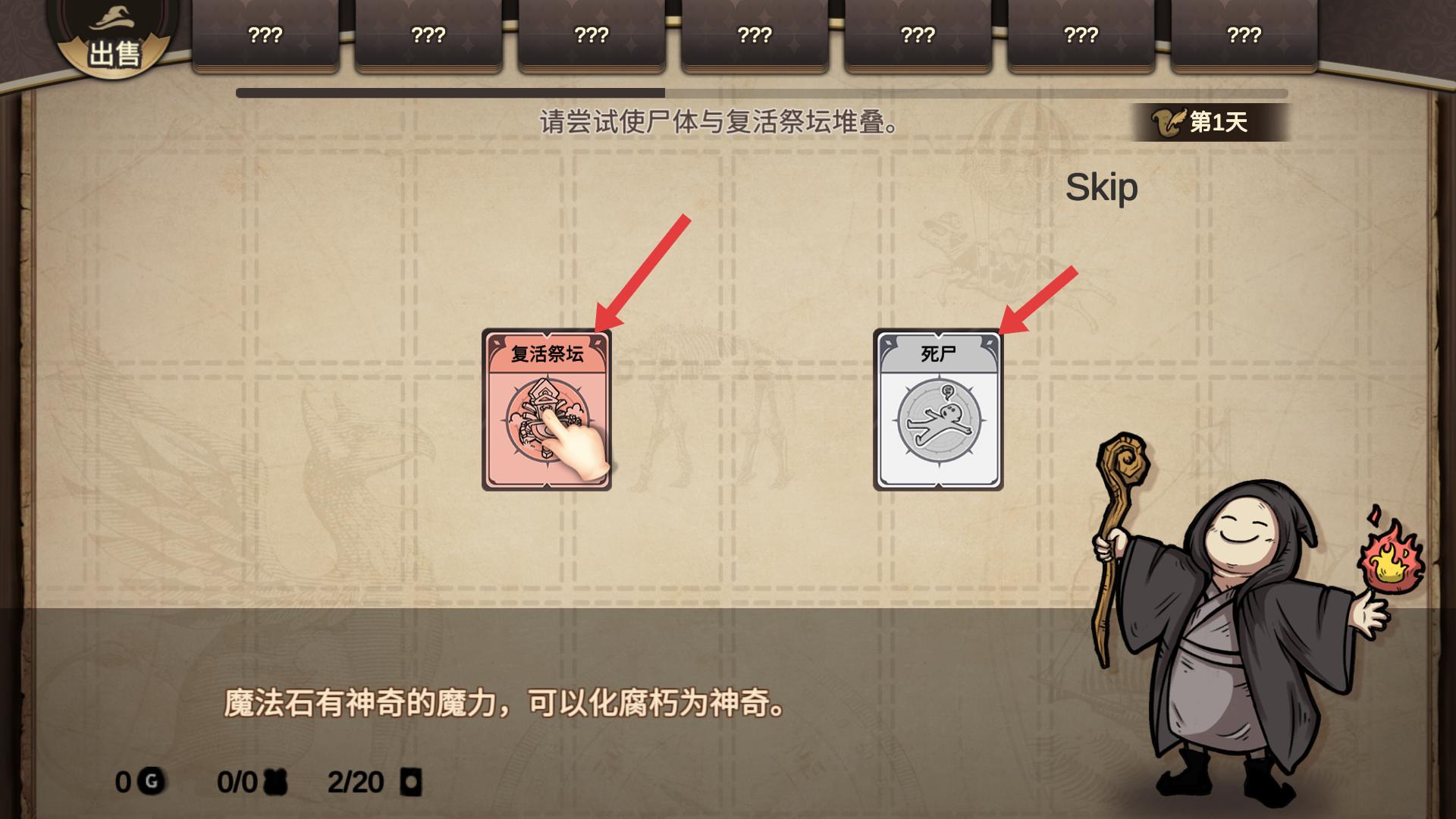 3、嘗試將死尸卡牌與復活祭壇卡牌堆疊,觸發效果,完成第1天對應任務,解鎖新內容。
