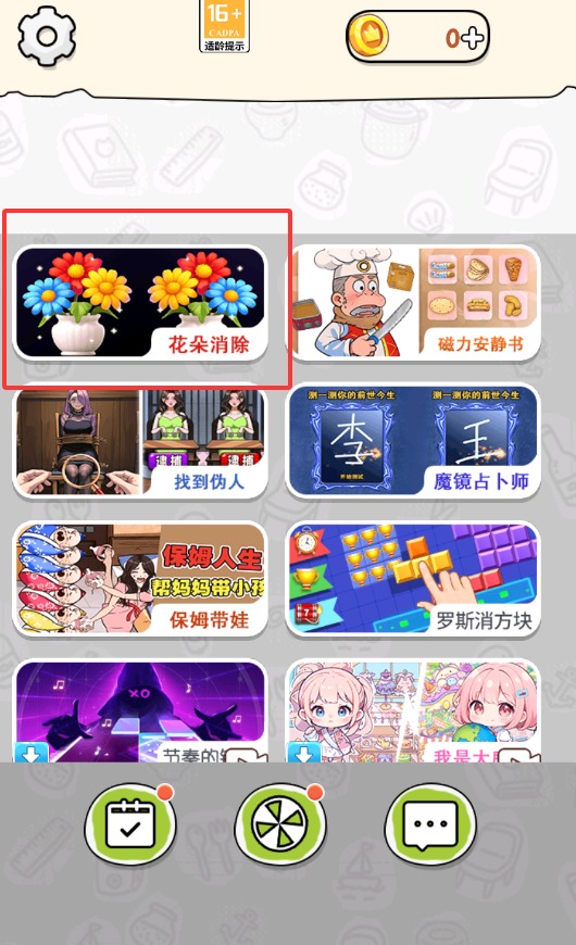 1、游戲主界面提供多種模式選擇,包含經典花朵消除、限時挑戰、找不同等趣味玩法,滿足各類玩家偏好。