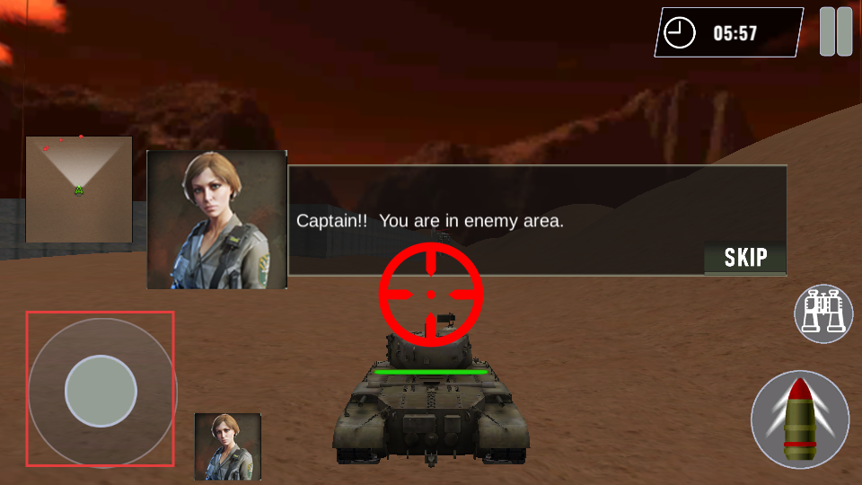 1、操控虛擬搖桿,駕駛坦克在沙漠等戰場移動,進入敵方區域,準備與敵人展開戰斗。