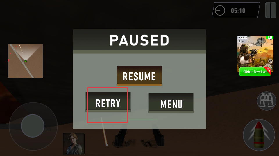 3、若戰斗失敗,點擊RETRY按鈕,重新開始戰斗,調整策略,再次駕駛坦克參與對抗。