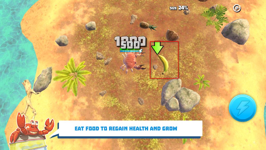 2、在場景中會分布著香蕉等食物,操控螃蟹靠近這些食物并食用,這樣能讓螃蟹恢復健康狀態,同時還能促使螃蟹長大。