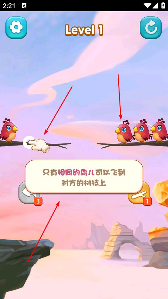 1、跟隨指引點擊相同顏色小鳥,將其移至對面樹枝,遵循同色飛行規則,快速熟悉操作,完成基礎關卡。