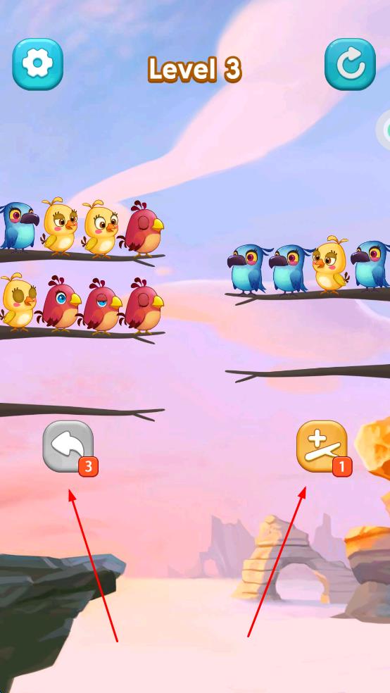 2、善用左側返回工具修正失誤,右側添加樹枝拓展空間,規劃多色小鳥分布,借工具優化布局攻克難關。