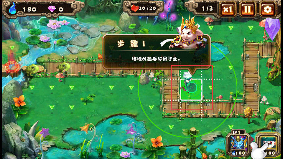 1、根據提示,選擇合適的角色,將弓箭手放置在指定的綠色區域,布置防御力量,準備應對敵人進攻。