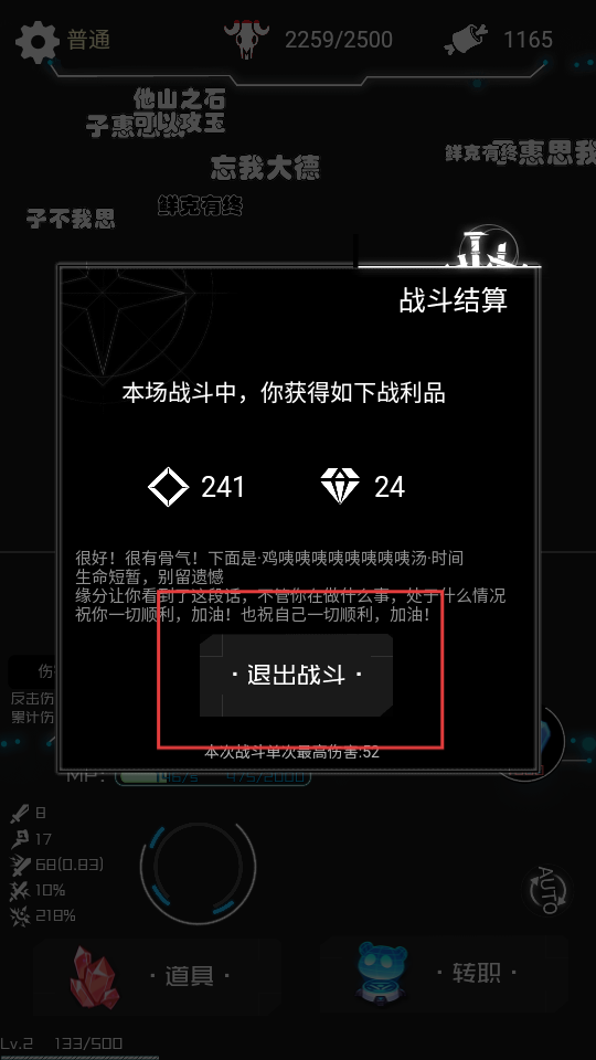3、戰斗結束后,會有戰斗結算界面,顯示獲得的戰利品,如菱形道具、鉆石等,然后點擊退出戰斗,可結束本次戰斗,準備后續挑戰。