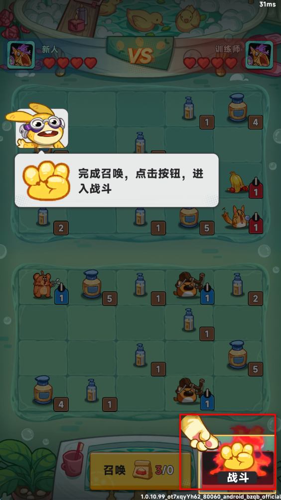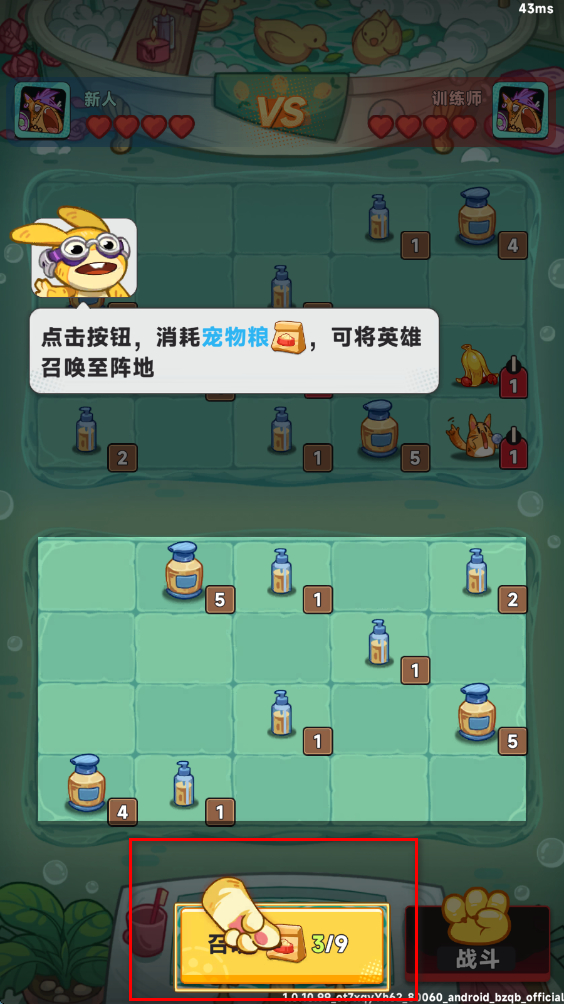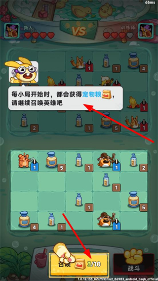 1、在對戰準備階段,點擊召喚按鈕,消耗寵物糧,將英雄召喚到陣地里以此組建己方的戰斗陣容。
