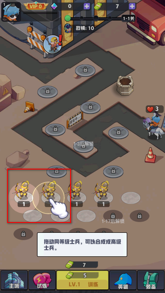 2、在士兵部署區域,拖動兩個相同等級的士兵,使其合成更高級士兵,增強防御端的整體戰斗力,應對敵人進攻。