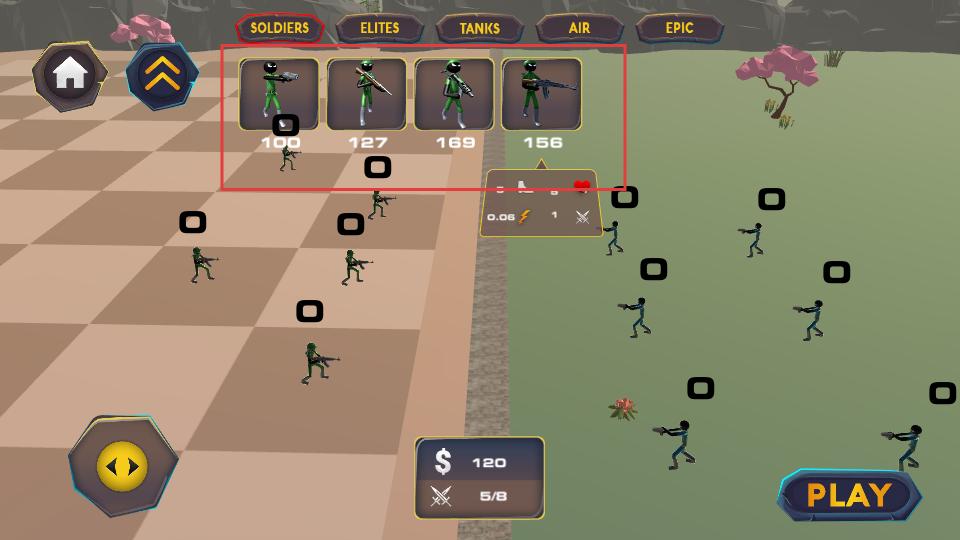 1、在士兵等兵種分類中選擇合適的火柴人士兵,布置到棋盤格戰場上,根據金幣數量合理安排,準備戰斗。