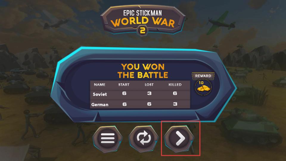 3、成功擊敗敵方后,戰斗勝利,可查看雙方起始、損失及擊殺數量,獲取金幣獎勵,之后可選擇繼續下一場戰斗。