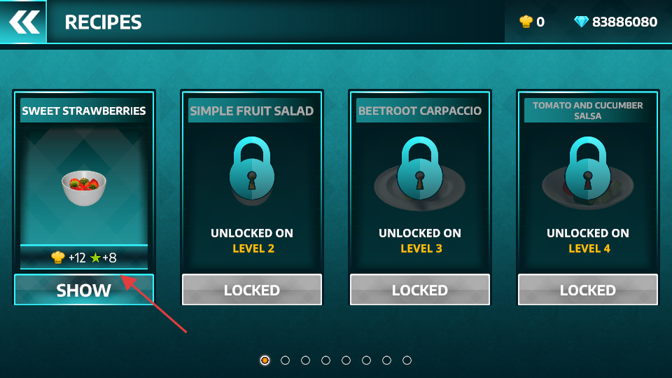 2、菜譜界面中SWEET STRAWBERRIES已解鎖,點擊SHOW,查看這道草莓料理的制作方法、所需食材,為烹飪做準備。