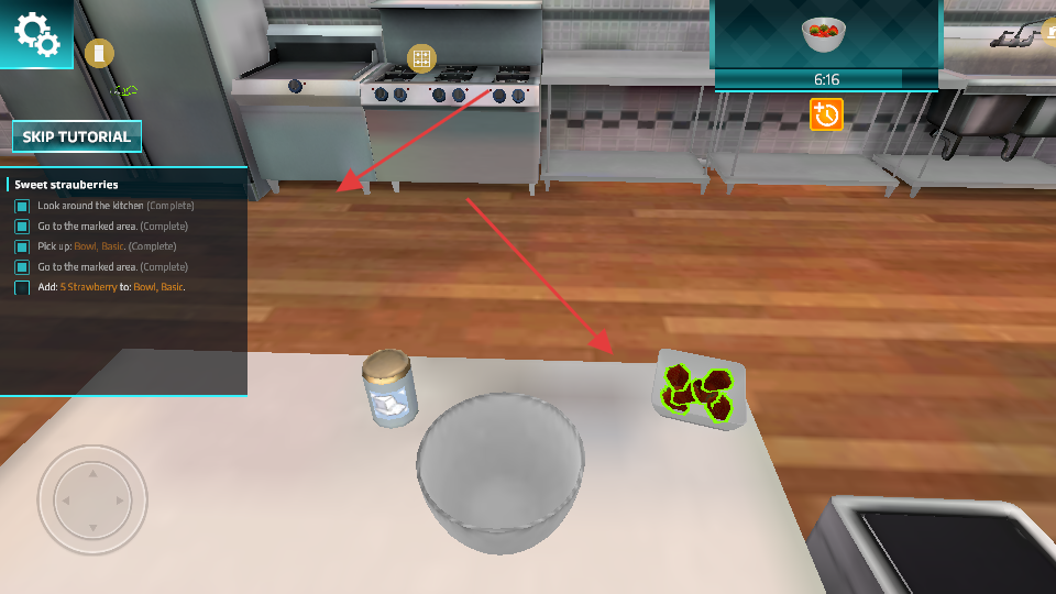 3、進入廚房任務,制作草莓甜品,根據指引,依次完成查看廚房、到達指定區域、拾取碗和草莓的步驟,開啟烹飪操作。
