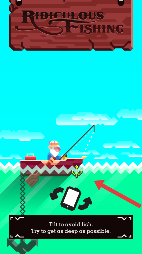 1、進入游戲會看到一個坐在船上的釣魚者,游戲開始時需要傾斜設備控制魚鉤下沉,在下沉過程中要避開魚,盡量下潛到更深的位置,以獲取更多機會釣到稀有魚類。