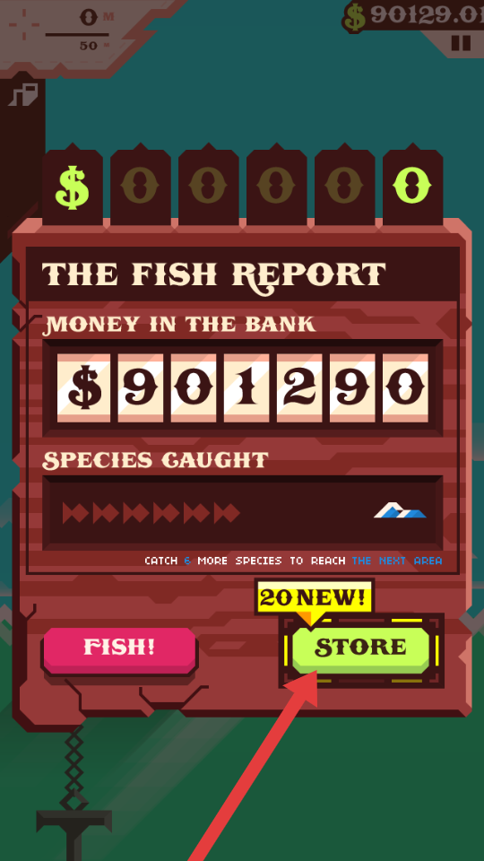 3、結束一輪釣魚后會顯示本次釣魚獲得的總金錢數和釣到的魚類種類,點擊STORE按鈕可以進入商店,使用釣魚獲得的金錢可以購買各種道具和裝備。