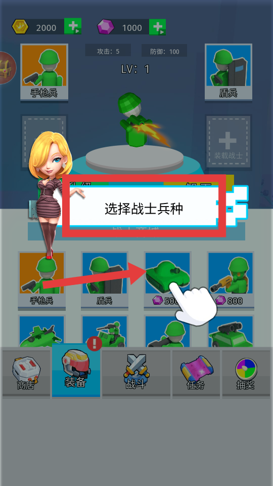 1、在裝備界面可挑選不同兵種手槍兵、盾兵、坦克等消耗金幣、紫晶等資源解鎖或升級,不同兵種攻擊、防御特性不同根據戰斗需求搭配,打造專屬部隊,提升整體戰力。