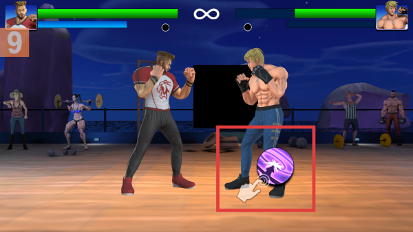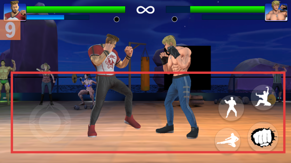 1、進入游戲對戰界面,左下角是虛擬搖桿,用于控制角色移動、靠近或遠離對手,右下角分布著不同的動作按鈕,合理點擊這些按鈕與對手展開戰斗。